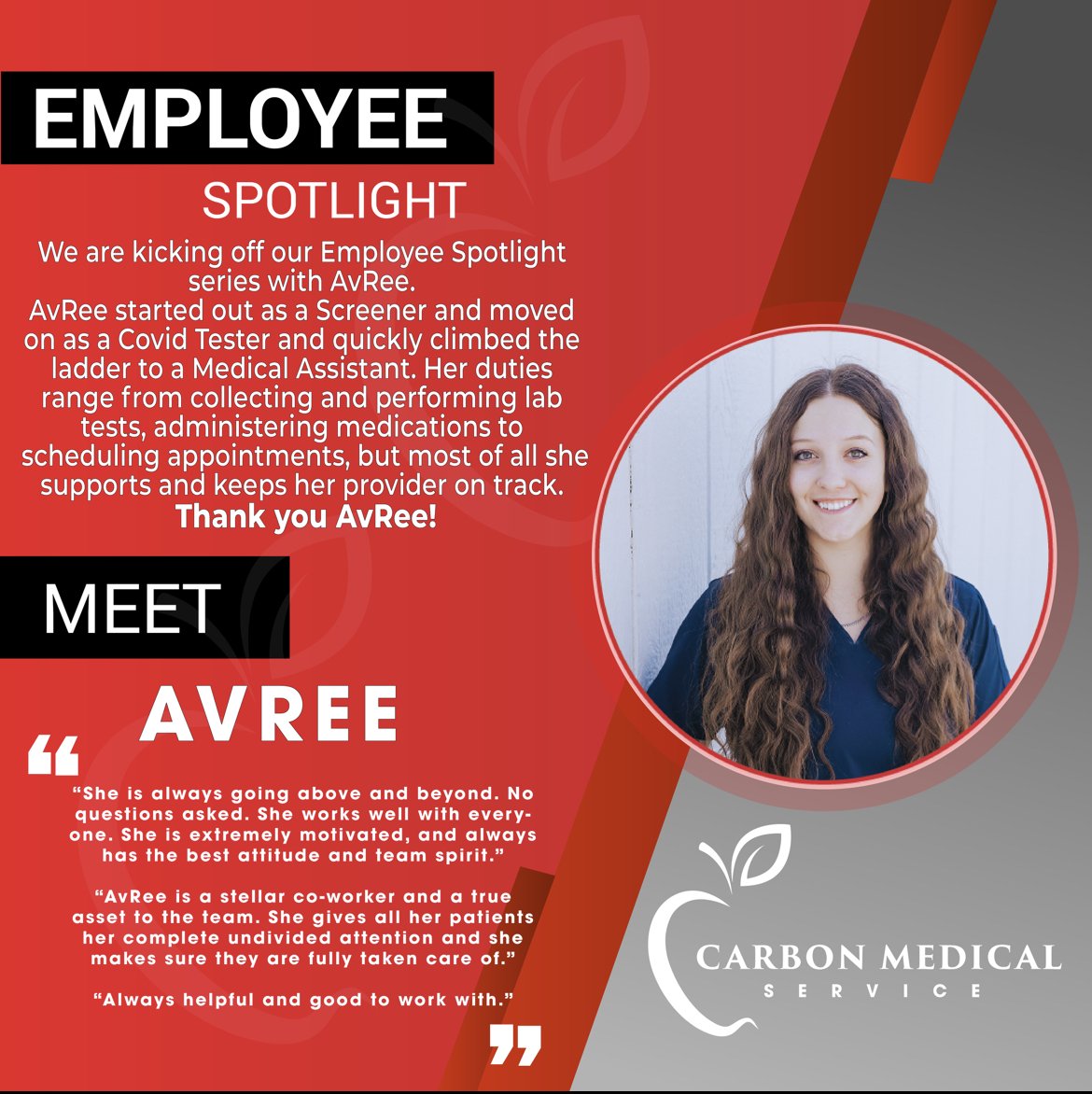 We are excited to start highlighting some of our amazing staff members. Our January spotlight is Avree! She’s been climbing the ranks here at Carbon Medical Service, starting as a Covid screener and is now a Medical Assistant. We are so happy Avree is a part of our team!